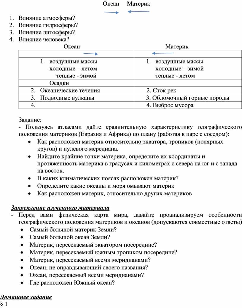 - Пользуясь атласами дайте сравнительную характеристику географического положения материков (Евразия и Африка) по плану (работая в паре с соседом):