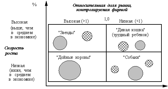Каждая СЗХ определяется кругом в этих координатах, причем площадь круга соответствует объему продаж в СЗХ или относительной доле СЗХ в продажах всей фирмы.