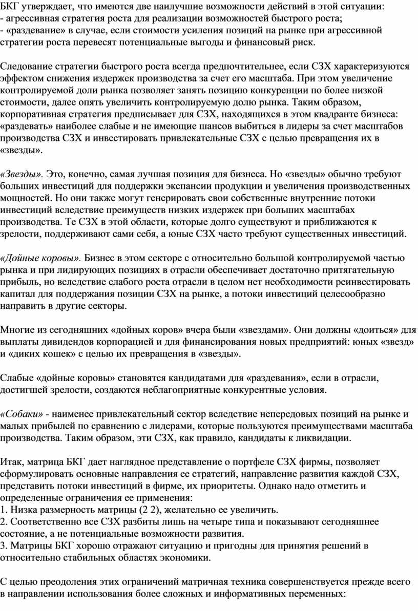 матрица БКГ дает наглядное представление о портфеле СЗХ фирмы, позволяет