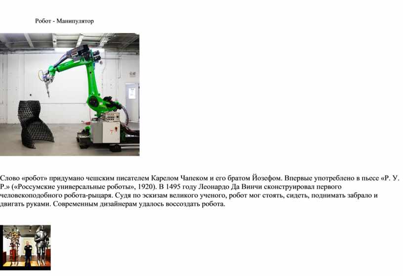 Слово «робот» придумано чешским писателем Карелом Чапеком и его братом Йозефом. Впервые употреблено в пьесе «Р. У. Р.» («Россумские универсальные роботы», 1920). В 1495 году Леонардо Да Винчи сконструировал первого человекоподобного робота-рыцаря. Судя по эскизам великого ученого, робот мог стоять, сидеть, поднимать забрало и двигать руками. Современным дизайнерам удалось воссоздать робота.