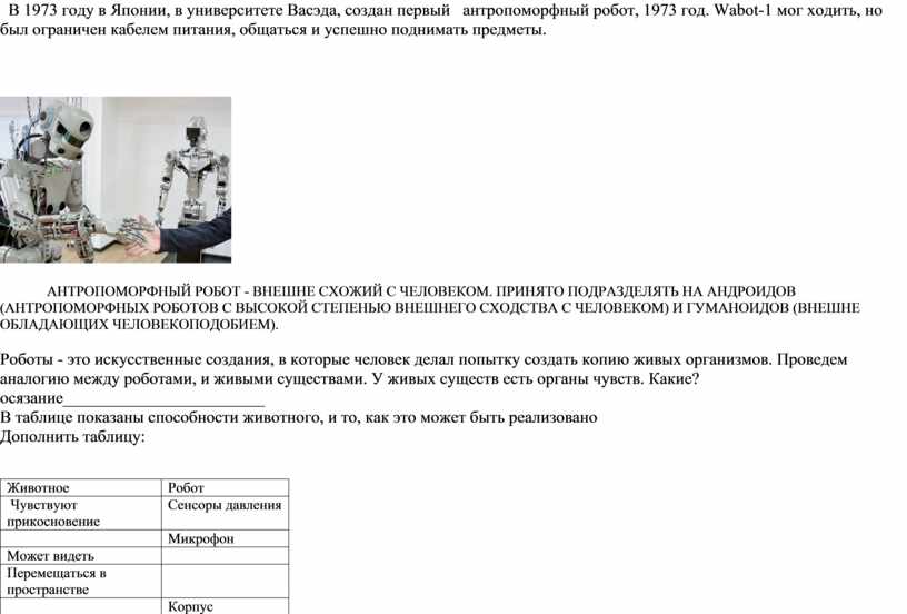 В 1973 году в Японии, в университете Васэда, создан первый антропоморфный робот, 1973 год. Wabot-1 мог ходить, но был ограничен кабелем питания, общаться и успешно поднимать предметы.