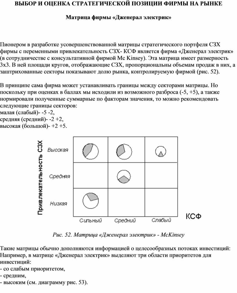 Пионером в разработке усовершенствованной матрицы стратегического портфеля СЗХ фирмы с переменными привлекательность СЗХ- КСФ является фирма «Дженерал электрик» (в сотрудничестве с консультативной фирмой Mc Kinsey). Эта матрица имеет размерность 3x3. В ней площади кругов, отображающие СЗХ, пропорциональны объемам продаж в них, а заштрихованные секторы показывают долю рынка, контролируемую фирмой (рис. 52).