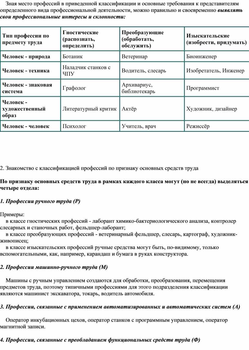 Зная место профессий в приведенной классификации и основные требования к представителям определенного вида профессиональной деятельности, можно правильно и своевременно выявлять свои профессиональные интересы и склонности: