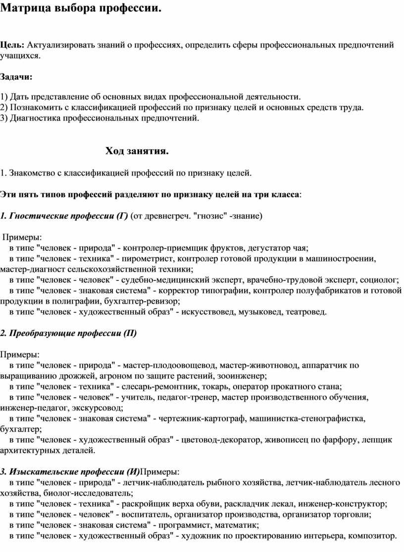 Матрица выбора профессии.