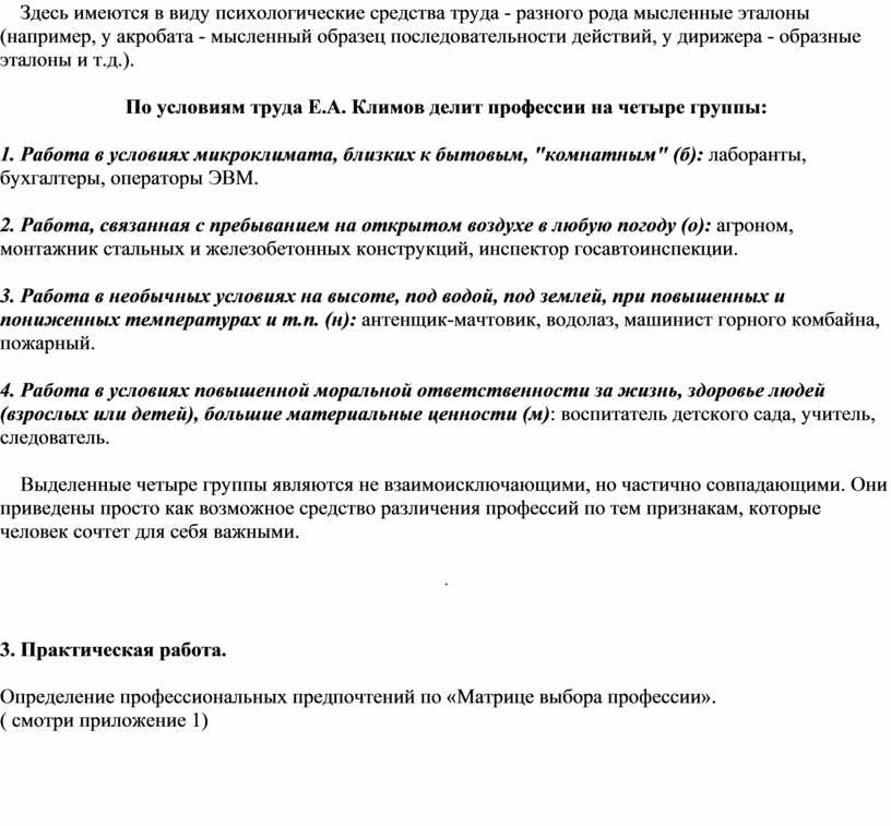 По условиям труда Е.А. Климов делит профессии на четыре группы: