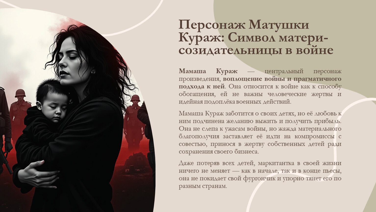 Мамаша Кураж заботится о своих детях, но её любовь к ним подчинена желанию выжить и получить прибыль. Она не слепа к ужасам войны, но жажда материального благополучия заставляет её идти на компромиссы с совестью, принося в жертву собственных детей ради сохранения своего бизнеса.