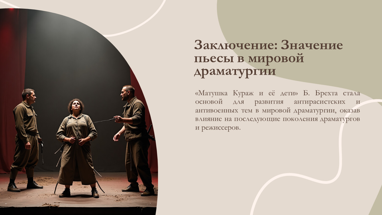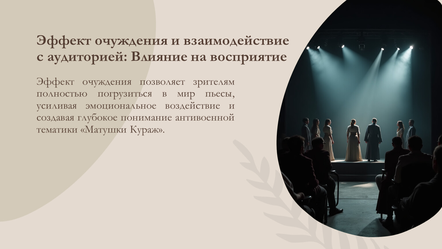 Эффект очуждения позволяет зрителям полностью погрузиться в мир пьесы, усиливая эмоциональное воздействие и создавая глубокое понимание антивоенной тематики «Матушки Кураж».