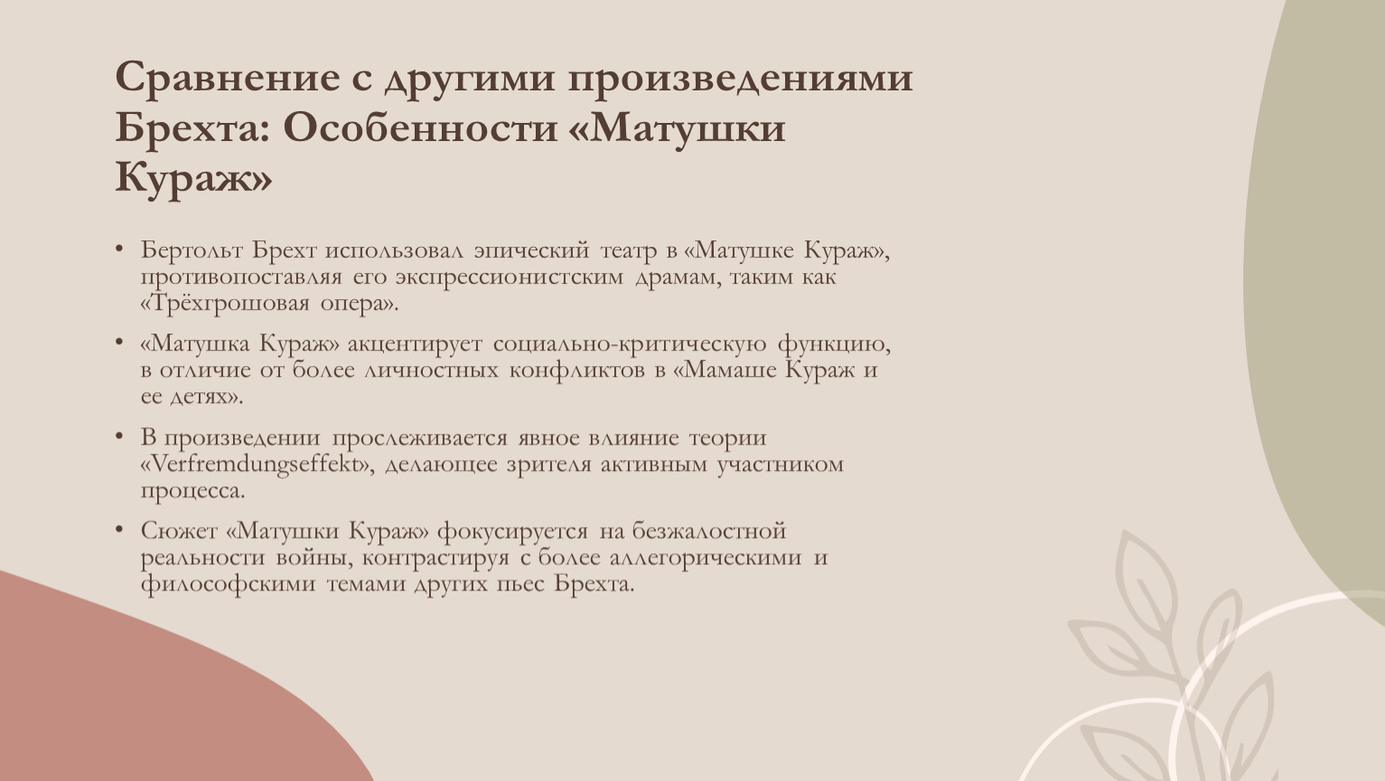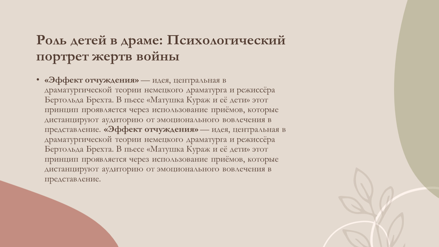 Эффект очуждения помогает раскрыть антивоенную тему пьесы, подчеркивая абсурдность и жестокость войны.