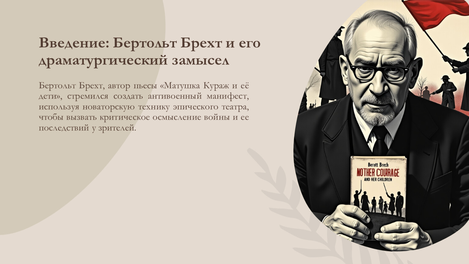 Бертольт Брехт, автор пьесы «Матушка Кураж и её дети», стремился создать антивоенный манифест, используя новаторскую технику эпического театра, чтобы вызвать критическое осмысление войны и ее последствий у зрителей.