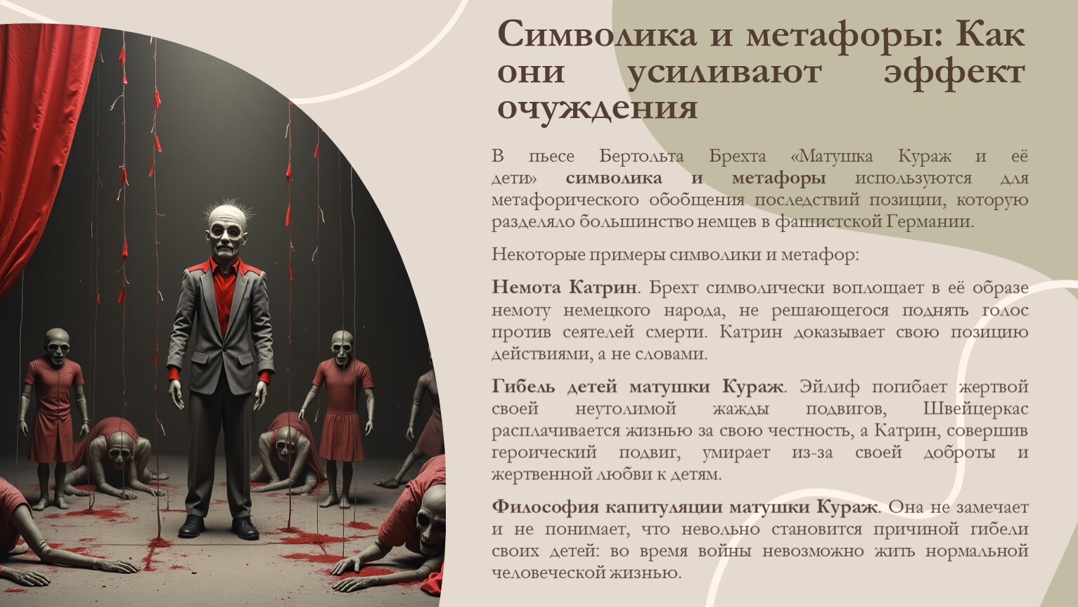 В пьесе Бертольта Брехта «Матушка Кураж и её дети» символика и метафоры используются для метафорического обобщения последствий позиции, которую разделяло большинство немцев в фашистской Германии.