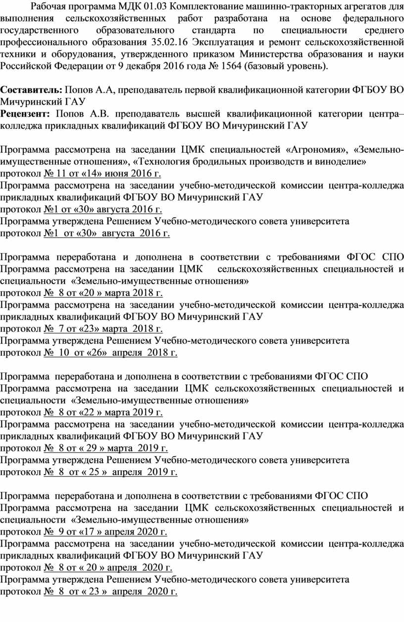 Рабочая программа МДК 01.03 Комплектование машинно-тракторных агрегатов для выполнения сельскохозяйственных работ разработана на основе федерального государственного образовательного стандарта по специальности среднего профессионального образования 35.02.16 Эксплуатация и ремонт сельскохозяйственной техники и оборудования, утвержденного приказом Министерства образования и науки Российской Федерации от 9 декабря 2016 года № 1564 (базовый уровень).