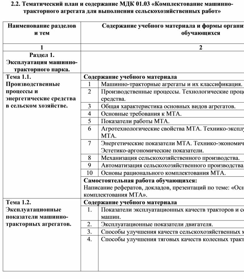 1.2. Место профессионального модуля в структуре основной профессиональной образовательной программы: МДК 01.03 «Комплектование машинно-тракторных агрегатов для выполнения сельскохозяйственных работ» входит в состав профессионального модуля.