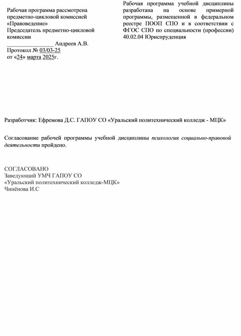 Рабочая программа рассмотрена предметно-цикловой комиссией «Правоведение» Председатель предметно-цикловой комиссии ________________ Андреев А.В. Протокол № 03/03-25 от «24» марта 2025г. |