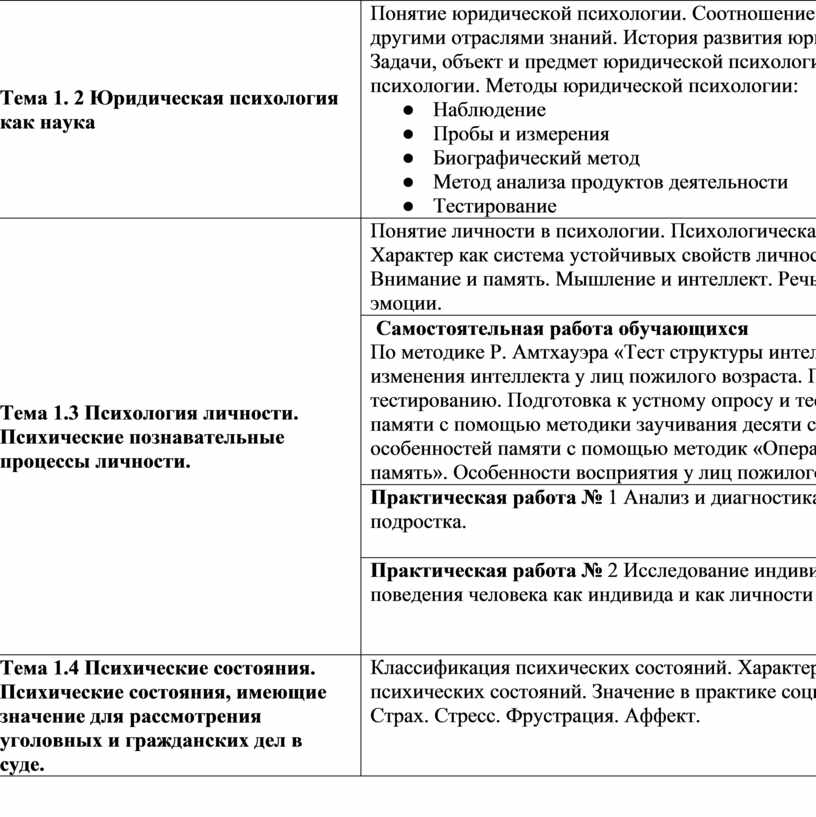 Понятие юридической психологии. Соотношение юридической психологии с другими отраслями знаний. История развития юридической психологии. Задачи, объект и предмет юридической психологии. Принципы юридической психологии. Методы юридической психологии: ● Наблюдение ● Пробы и измерения ● Биографический метод ● Метод анализа продуктов деятельности ● Тестирование |