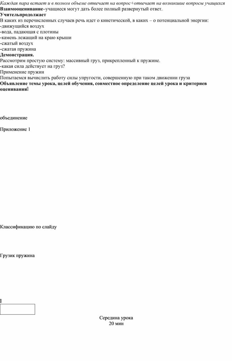 Организационный момент. Приветствие учащихся. Проверка домашнего задания. Упражнение (реш зад) проверить (взаимооценивание) Работа в парах (Деление по домино) Раздать каждой паре вопросы. 1.Что называют механической энергией тела?Что такое полная механическая энергия? 2. Что называется кинетической энергией? Какими признаками обладает кинетическая энергия? 3. Что понимают под потенциальной энергией тел? Какими признаками обладает потенциальная энергия? 4. Как происходит превращение кинетической энергии в потенциальную энергию? Приведите примеры. 5. Как можно объяснить физический смысл работы, опираясь на закон сохранения и превращения энергии? В случае затруднений ответов, учащиеся в качестве подсказки используют материал с учебника. Каждая пара встает и в полном объеме отвечает на вопрос+отвечает на возникшие вопросы учащихся Взаимооценивание–учащиеся могут дать более полный развернутый ответ. Учительпродолжает В каких из перечисленных случаев речь идет о кинетической, в каких – о потенциальной энергии: -движущийся воздух -вода, падающая с плотины -камень лежащий на краю крыши -сжатый воздух -сжатая пружина Демонстрация. Рассмотрим простую систему: массивный груз, прикрепленный к пружине. -какая сила действует на груз? Применение пружин Попытаемся вычислить работу силы упругости, совершенную при таком движении груза Объявление темы урока, целей обучения, совместное определение целей урока и критериев оценивания |