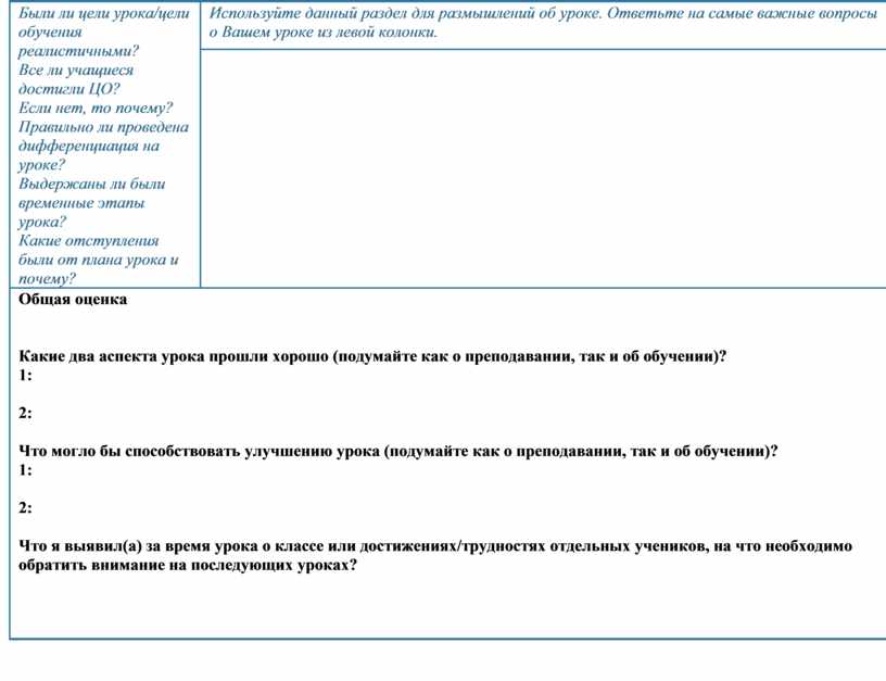 Используйте данный раздел для размышлений об уроке. Ответьте на самые важные вопросы о Вашем уроке из левой колонки. |
