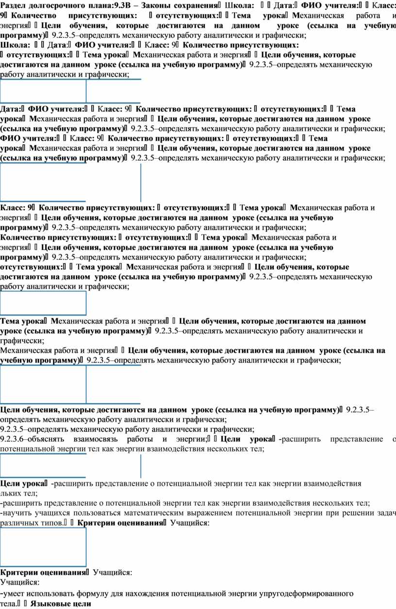 9.2.3.5–определять механическую работу аналитически и графически; 9.2.3.6–объяснять взаимосвязь работы и энергии; |