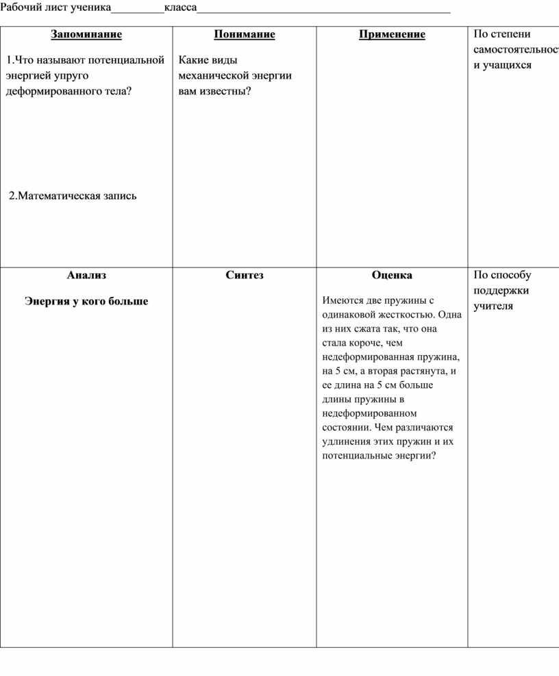 Оценка Имеются две пружины с одинаковой жесткостью. Одна из них сжата так, что она стала короче, чем недеформированная пружина, на 5 см, а вторая растянута, и ее длина на 5 см больше длины пружины в недеформированном состоянии. Чем различаются удлинения этих пружин и их потенциальные энергии?