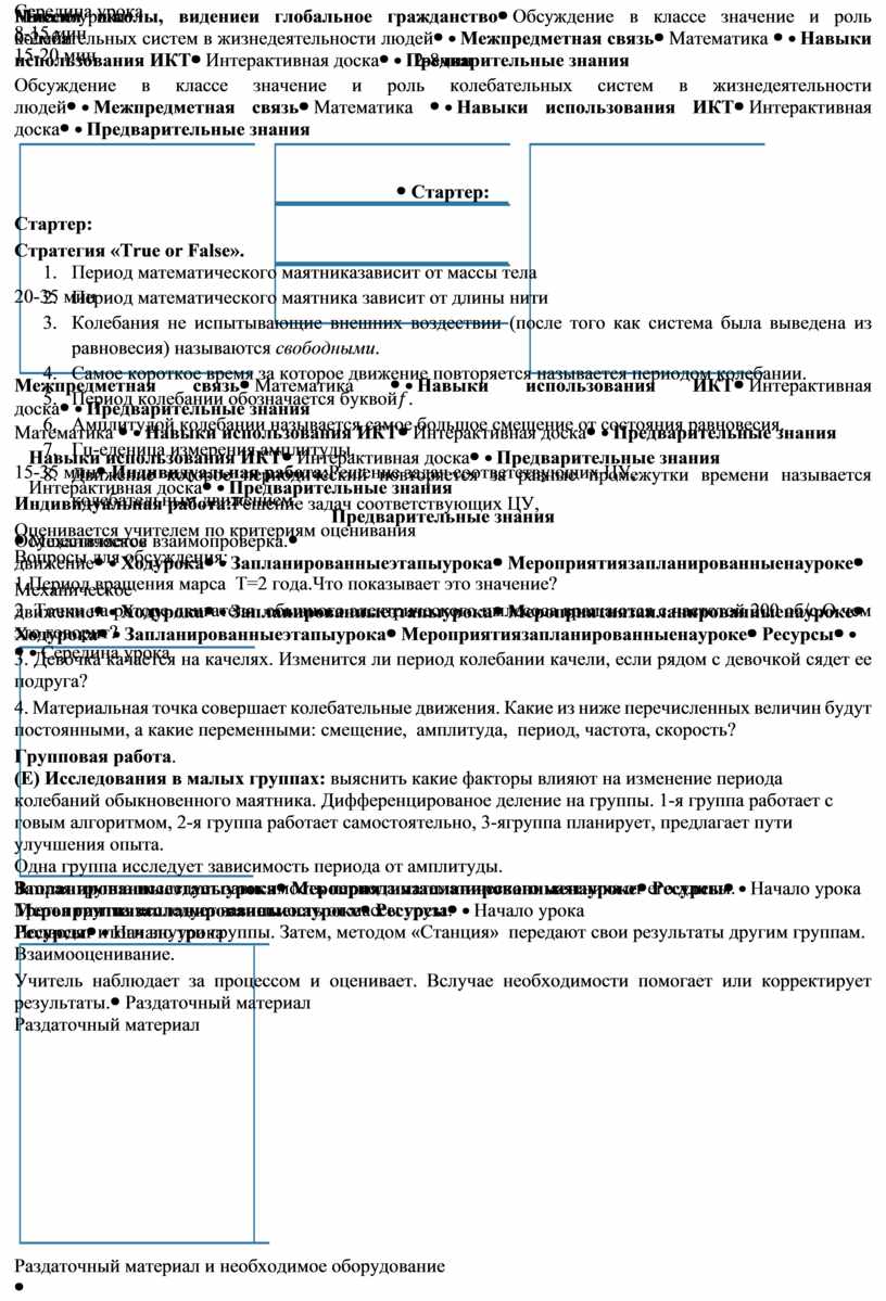 Стартер: Стратегия «True or False». 1. Период математического маятниказависит от массы тела 2. Период математического маятника зависит от длины нити 3. Колебания не испытывающие внешних воздествии (после того как система была выведена из равновесия) называются свободными. 4. Самое короткое время за которое движение повторяется называется периодом колебании. 5.