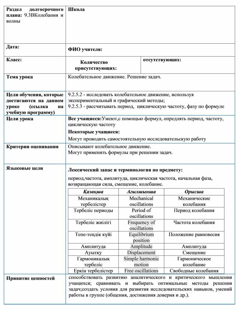 9.2.5.2 - исследовать колебательное движение, используя экспериментальный и графический методы; 9.2.5.3 - рассчитывать период, циклическую частоту, фазу по формуле |