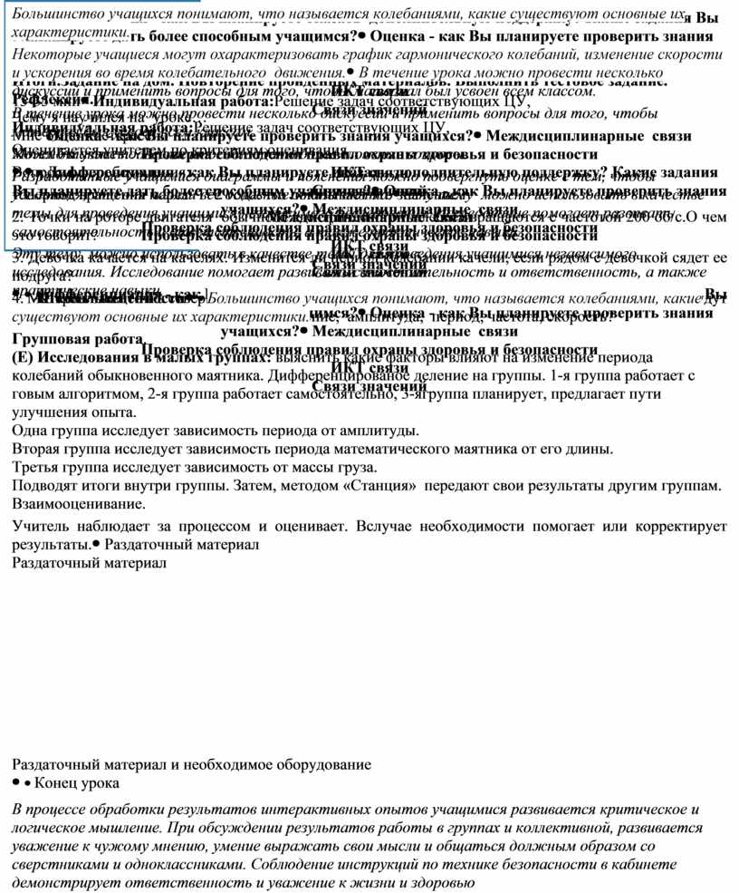 Индивидуальная работа:Решение задач соответствующих ЦУ, Оценивается учителем по критериям оценивания Вопросы для обсуждения: 1.Период вращения марса Т=2 года.Что показывает это значение? 2. Точки на роторе двигателя обычного электрического пылесоса вращаются с частотой 200 об/с.О чем это говорит? 3. Девочка качается на качелях. Изменится ли период колебании качели, если рядом с девочкой сядет ее подруга? 4. Материальная точка совершает колебательные движения. Какие из ниже перечисленных величин будут постоянными, а какие переменными: смещение, амплитуда, период, частота, скорость? Групповая работа. (E) Исследования в малых группах: выяснить какие факторы влияют на изменение периода колебаний обыкновенного маятника. Дифференцированое деление на группы. 1-я группа работает с говым алгоритмом, 2-я группа работает самостоятельно, 3-ягруппа планирует, предлагает пути улучшения опыта. Одна группа исследует зависимость периода от амплитуды. Вторая группа исследует зависимость периода математического маятника от его длины. Третья группа исследует зависимость от массы груза. Подводят итоги внутри группы. Затем, методом «Станция» передают свои результаты другим группам. Взаимооценивание. Учитель наблюдает за процессом и оценивает. Вслучае необходимости помогает или корректирует результаты. |