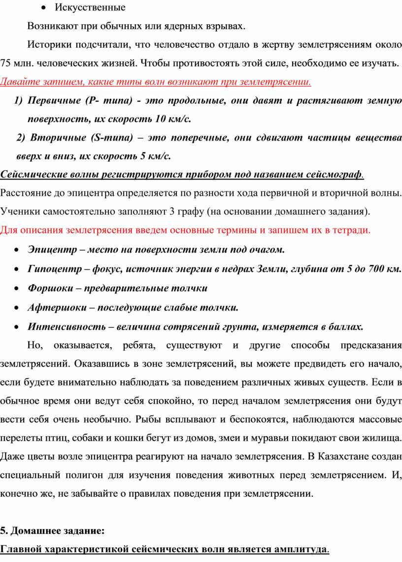Для описания землетрясения введем основные термины и запишем их в тетради.