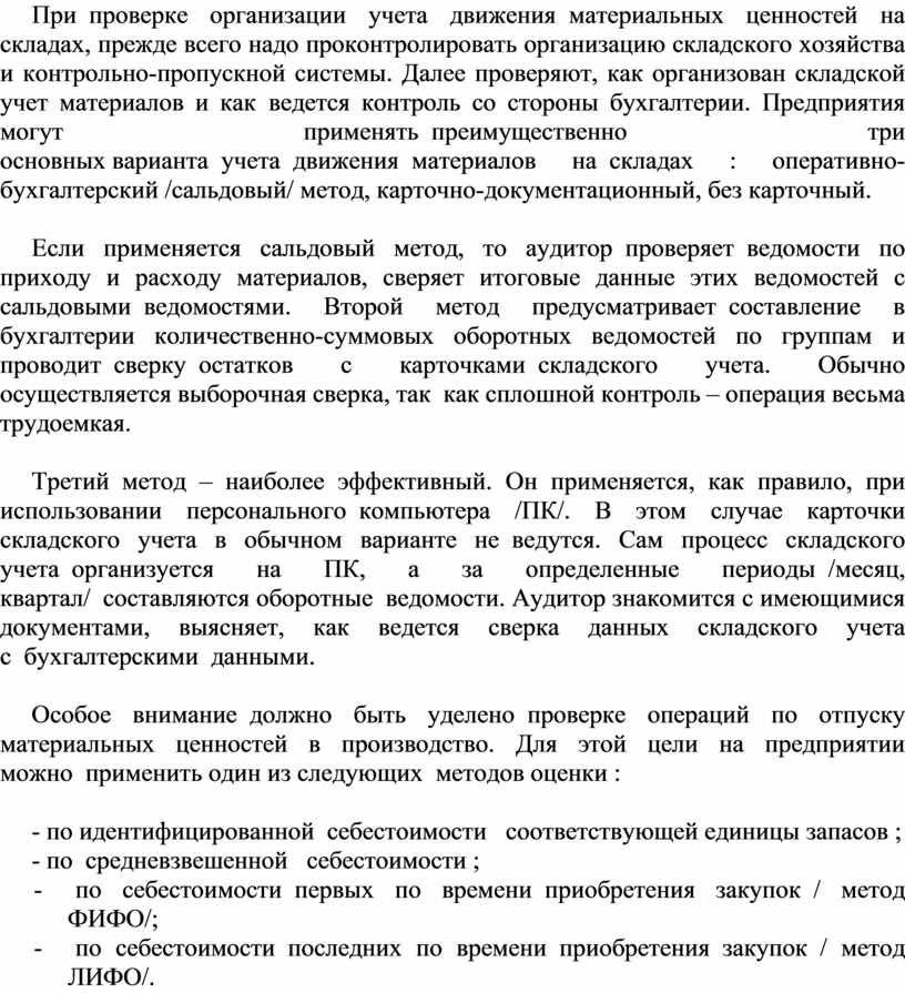 Особое внимание должно быть уделено проверке операций по отпуску материальных ценностей в производство. Для этой цели на предприятии можно применить один из следующих методов оценки :