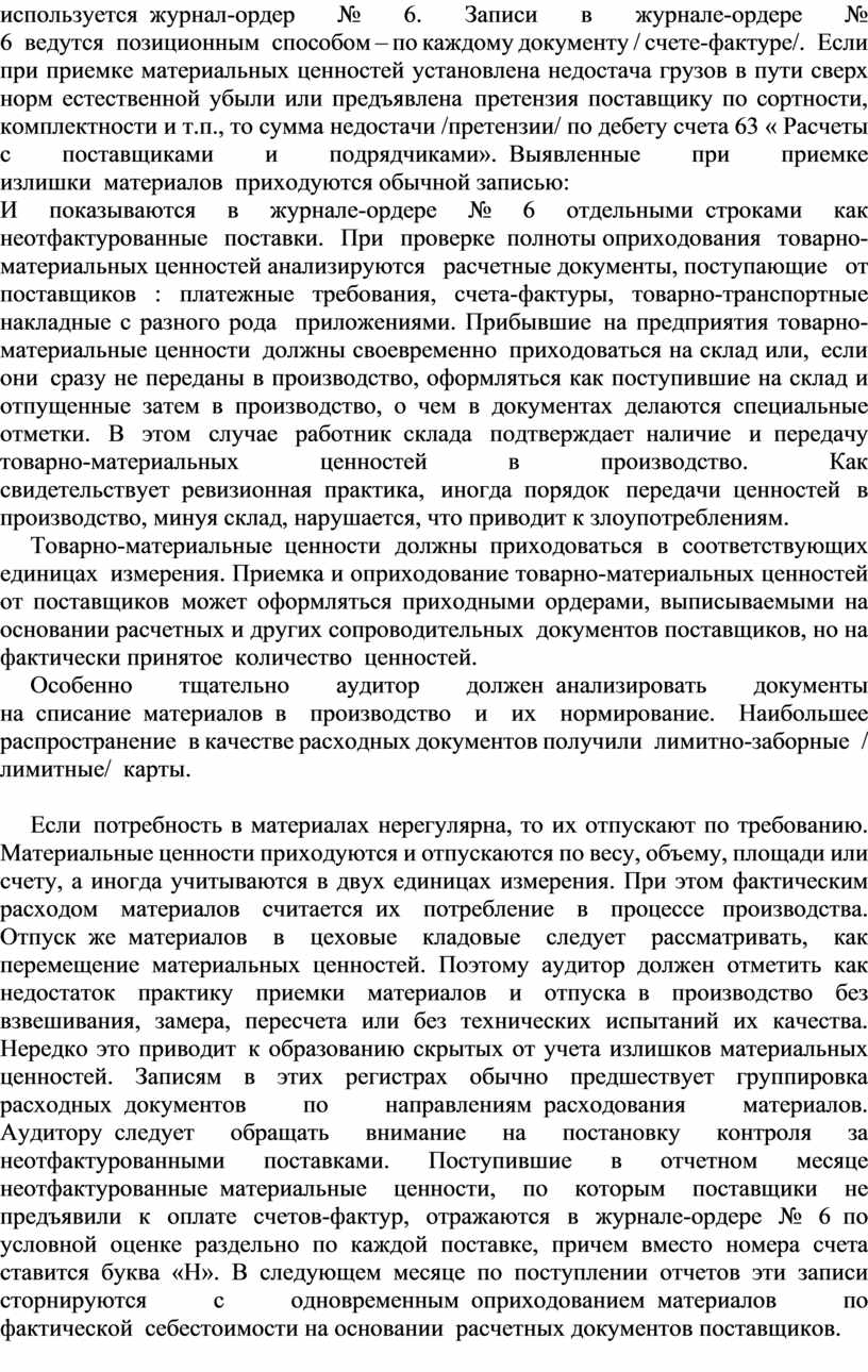 И показываются в журнале-ордере № 6 отдельными строками как неотфактурованные поставки. При проверке полноты оприходования товарно-материальных ценностей анализируются расчетные документы, поступающие от поставщиков : платежные требования, счета-фактуры, товарно-транспортные накладные с разного рода приложениями. Прибывшие на предприятия товарно-материальные ценности должны своевременно приходоваться на склад или, если они сразу не переданы в производство, оформляться как поступившие на склад и отпущенные затем в производство, о чем в документах делаются специальные отметки. В этом случае работник склада подтверждает наличие и передачу товарно-материальных ценностей в производство. Как свидетельствует ревизионная практика, иногда порядок передачи ценностей в производство, минуя склад, нарушается, что приводит к злоупотреблениям.