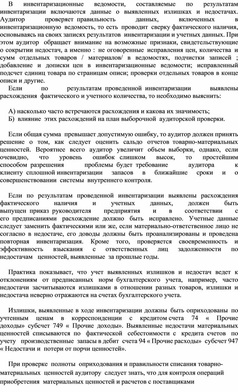 В инвентаризационные ведомости, составляемые по результатам инвентаризации включаются данные о выявленных излишках и недостачах. Аудитор проверяет правильность данных, включенных в инвентаризационную ведомость, то есть проводит сверку фактического наличия, основываясь на своих записях результатов инвентаризации и учетных данных. При этом аудитор обращает внимание на возможные признаки, свидетельствующие о сокрытии недостач, а именно : не оговоренные исправления цен, количества и сумм отдельных товаров / материалов/ в ведомостях, подчистки записей ; добавление и дописки цен в инвентаризационные ведомости; исправленный подсчет единиц товара по страницам описи; проверки отдельных товаров в конце описи и другие.