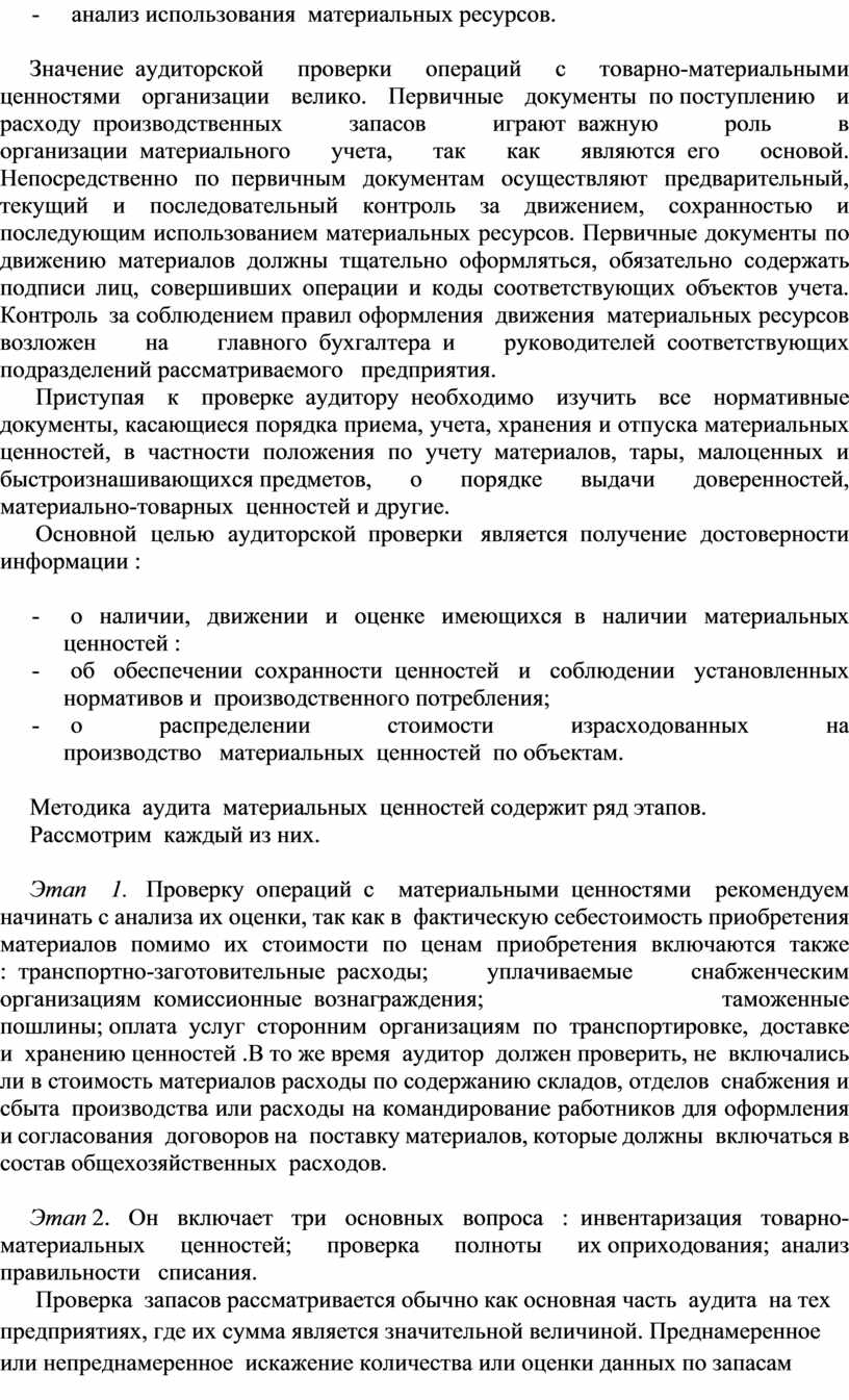 Этап 1. Проверку операций с материальными ценностями рекомендуем начинать с анализа их оценки, так как в фактическую себестоимость приобретения материалов помимо их стоимости по ценам приобретения включаются также : транспортно-заготовительные расходы; уплачиваемые снабженческим организациям комиссионные вознаграждения; таможенные пошлины; оплата услуг сторонним организациям по транспортировке, доставке и хранению ценностей .В то же время аудитор должен проверить, не включались ли в стоимость материалов расходы по содержанию складов, отделов снабжения и сбыта производства или расходы на командирование работников для оформления и согласования договоров на поставку материалов, которые должны включаться в состав общехозяйственных расходов.