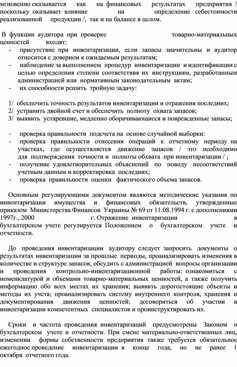 Проверка запасов рассматривается обычно как основная часть аудита на тех предприятиях, где их сумма является значительной величиной. Преднамеренное или непреднамеренное искажение количества или оценки данных по запасам мгновенно сказывается как на финансовых результатах предприятия / поскольку оказывает влияние на определение себестоимости реализованной продукции /, так и на балансе в целом.