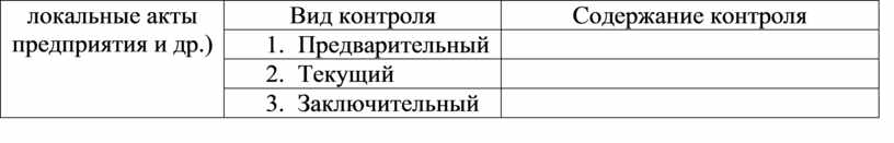 Разработайте проект реализации трех видов контроля: предварительного, текущего и заключительного. Результаты оформите в таблице: