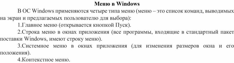 В ОС Windows применяются четыре типа меню (меню – это список команд, выводимых на экран и предлагаемых пользователю для выбора):