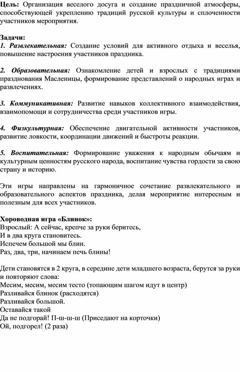 Цель: Организация веселого досуга и создание праздничной атмосферы, способствующей укреплению традиций русской культуры и сплоченности участников мероприятия.