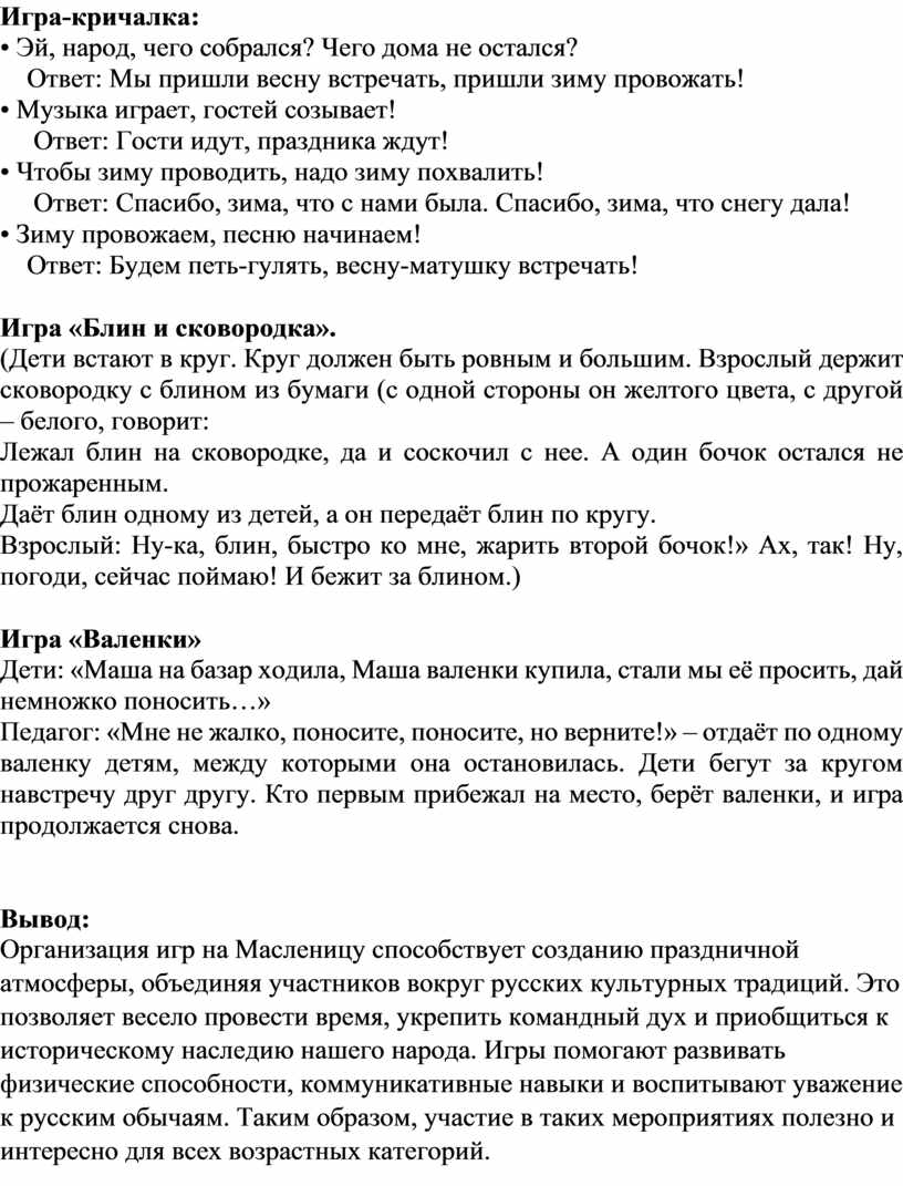 Организация игр на Масленицу способствует созданию праздничной атмосферы, объединяя участников вокруг русских культурных традиций. Это позволяет весело провести время, укрепить командный дух и приобщиться к историческому наследию нашего народа. Игры помогают развивать физические способности, коммуникативные навыки и воспитывают уважение к русским обычаям. Таким образом, участие в таких мероприятиях полезно и интересно для всех возрастных категорий.