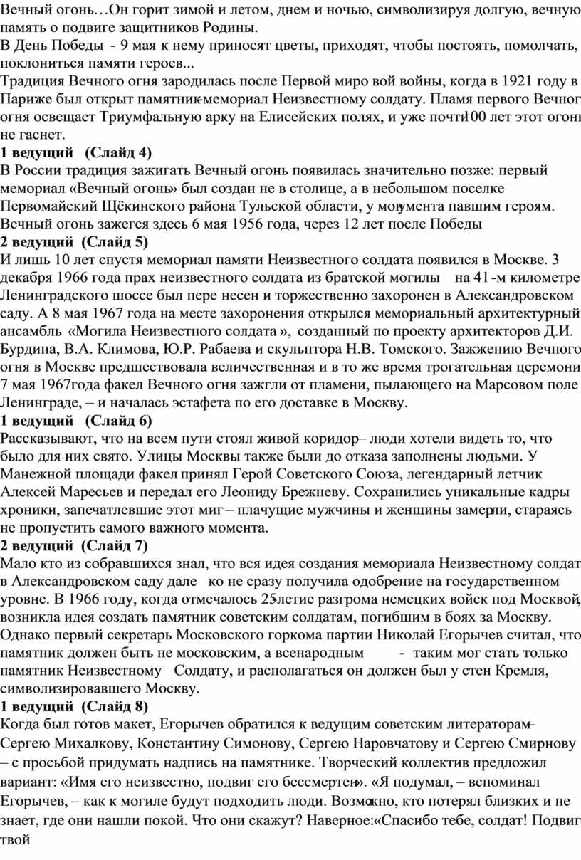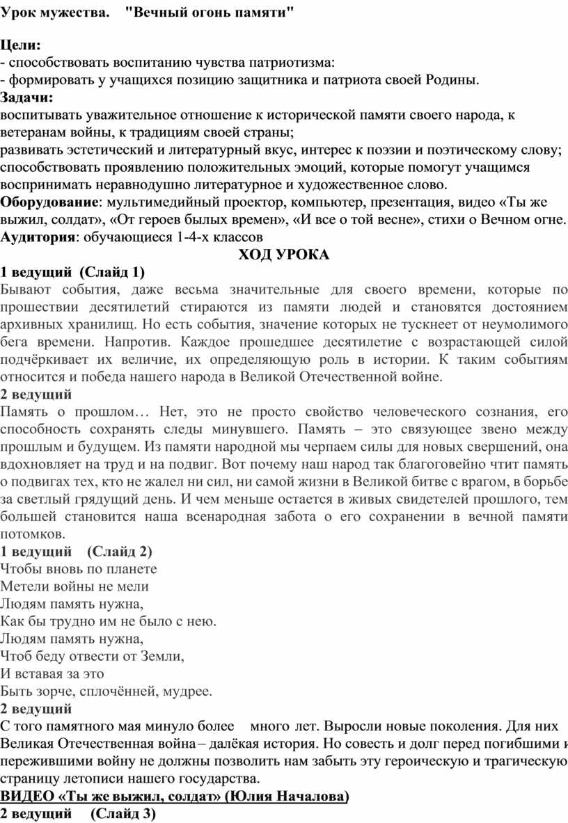 Оборудование: мультимедийный проектор, компьютер, презентация, видео «Ты же выжил, солдат», «От героев былых времен», «И все о той весне», стихи о Вечном огне.