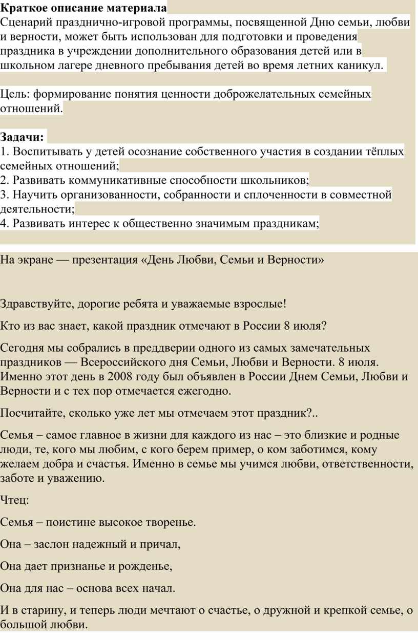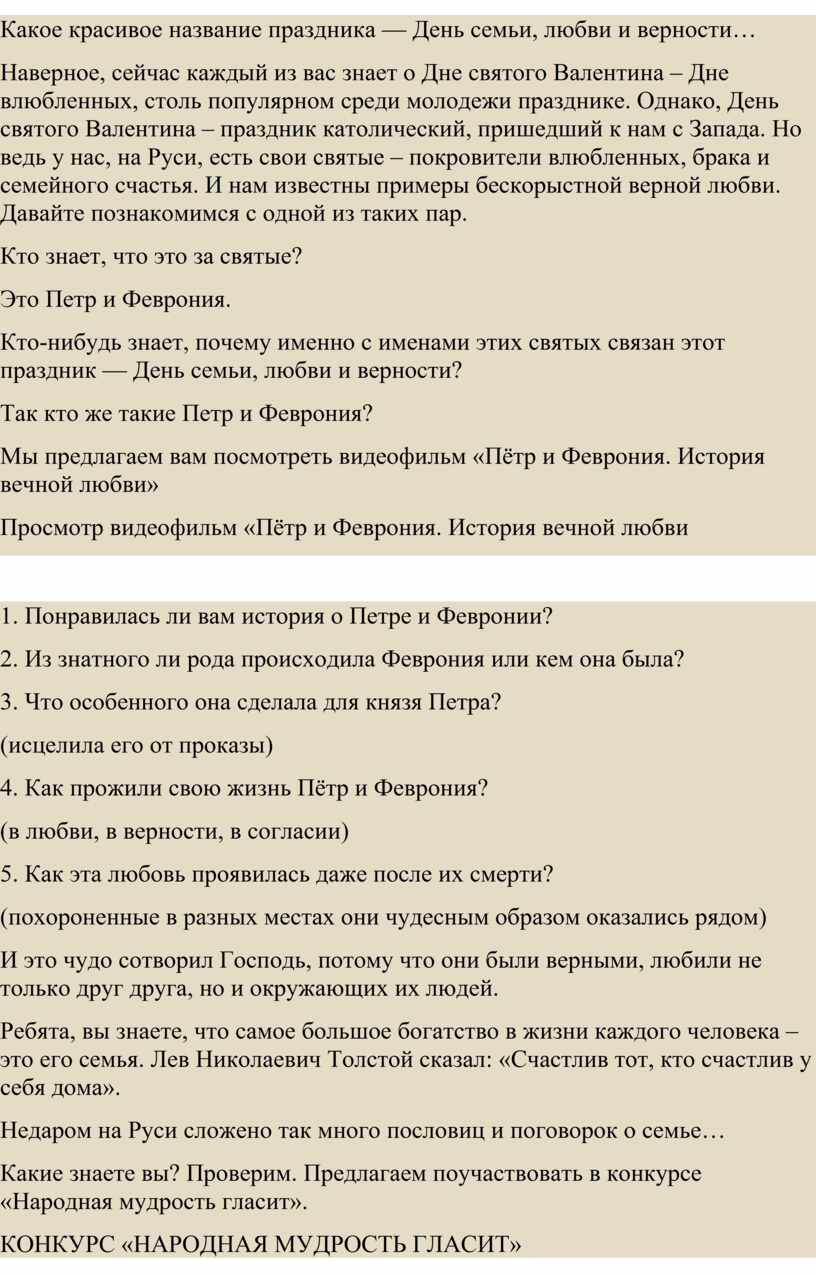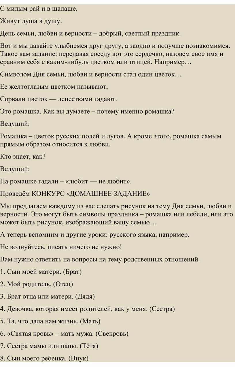 посвященной Дню семьи, любви и верности, может быть использован для подготовки