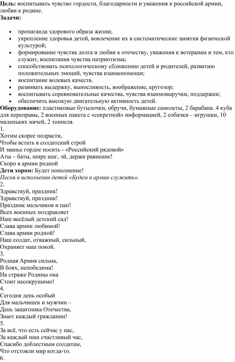 Цель: воспитывать чувство гордости, благодарности и уважения к российской армии, любви к родине.