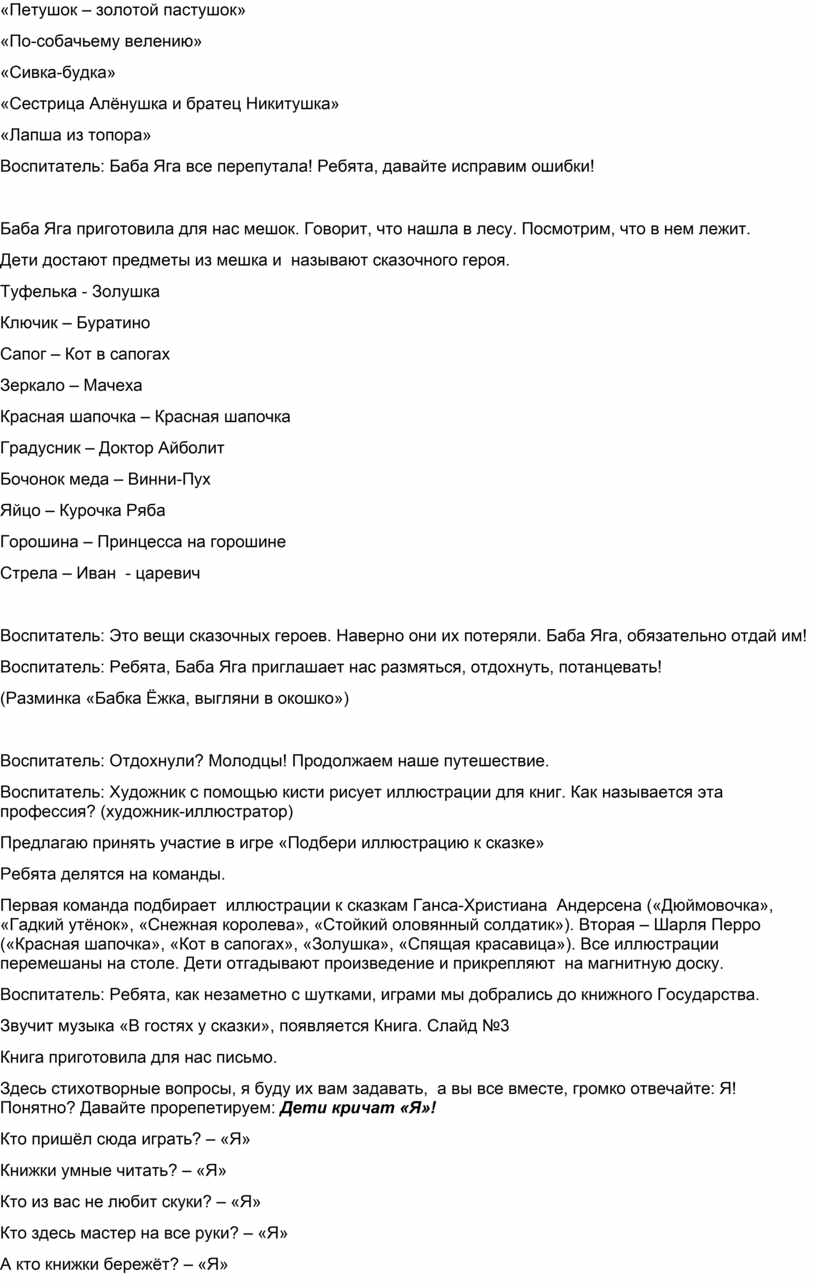 Воспитатель: Ребята! Сегодня мы с вами отправимся в необыкновенное путешествие – в прекрасную страну Книги. Я уверена, что вы любите книги и будете активно участвовать в нашем путешествии. Закройте глаза и повторяйте: «Раз, два, три, дверцу, Книга, отвори!»