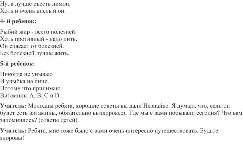 Учитель: Молодцы ребята, хорошие советы вы дали Незнайке. Я думаю, что, если он будет есть витамины, обязательно выздоровеет. Где мы с вами побывали сегодня? Что вам запомнилось? (ответы детей).