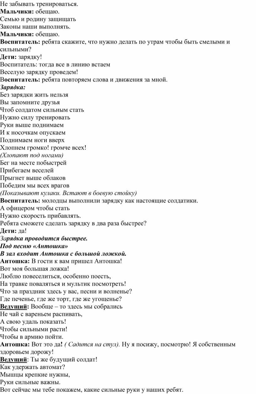 Ведущий: Да, Антошка! Знаний у тебя совсем нет! Да и вид совсем не спортивный. В армию берут здоровых и сильных ребят, которые дружат с физкультурой.