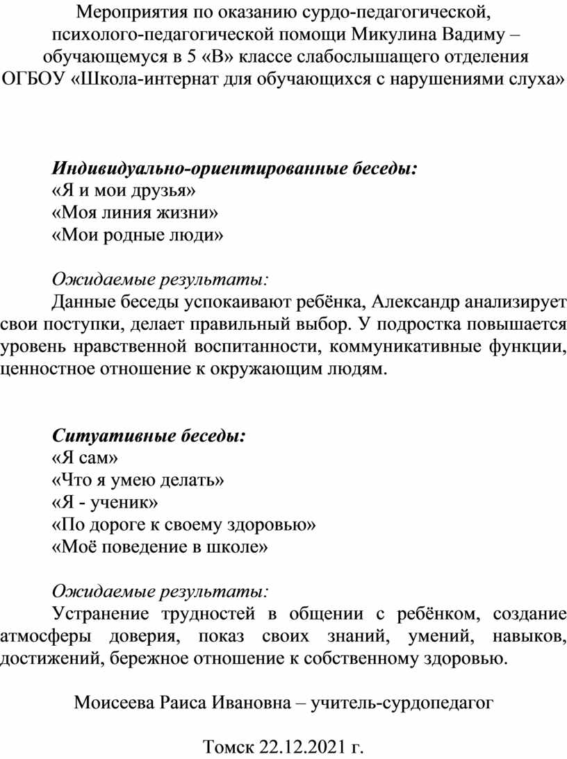 Данные беседы успокаивают ребёнка, Александр анализирует свои поступки, делает правильный выбор. У подростка повышается уровень нравственной воспитанности, коммуникативные функции, ценностное отношение к окружающим людям.