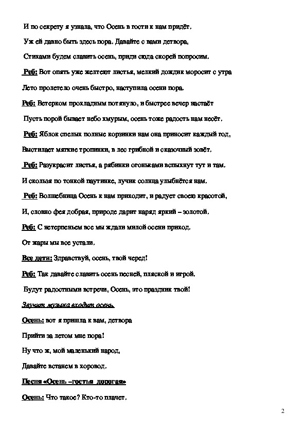 Вед: Как звонко музыка звучала! Нас чудный праздник нынче ждёт,И по секрету я узнала, что Осень в гости к нам придёт.