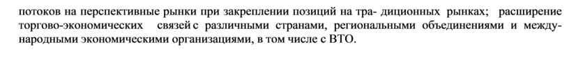 потоков на перспективные рынки при закреплении позиций на тра- диционных рынках; расширение торгово-экономических связей с различными странами, региональными объединениями и между- народными экономическими организациями, в том числе с ВТО.