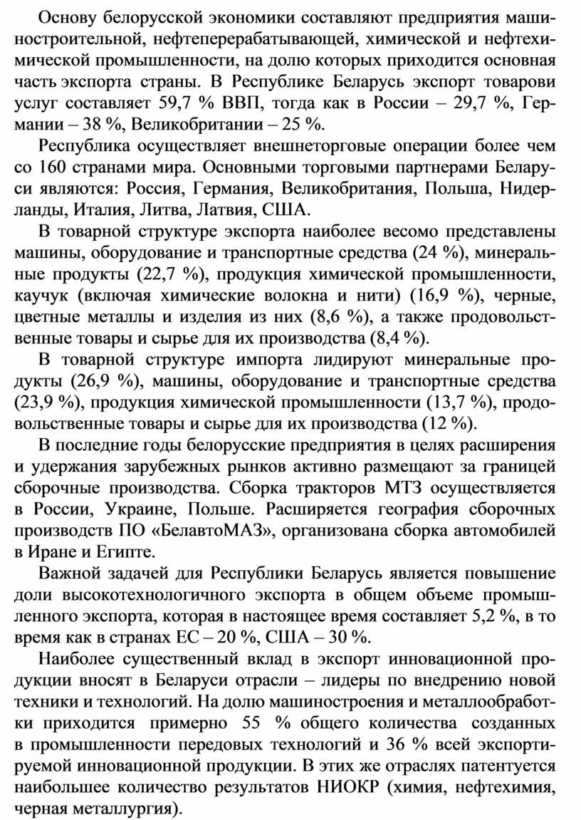 Основу белорусской экономики составляют предприятия маши- ностроительной, нефтеперерабатывающей, химической и нефтехи- мической промышленности, на долю которых приходится основная часть экспорта страны. В Республике Беларусь экспорт товаров и услуг составляет 59,7 % ВВП, тогда как в России – 29,7 %, Гер- мании – 38 %, Великобритании – 25 %.