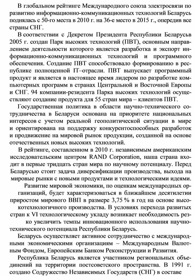 Государственная политика в области научно-технического со- трудничества в Беларуси основана на приоритете национальных интересов с учетом реальной геополитической ситуации в мире и ориентирована на поддержку конкурентоспособных разработок и продвижение на мировой рынок продукции, созданной на основе отечественных новых высоких технологий.