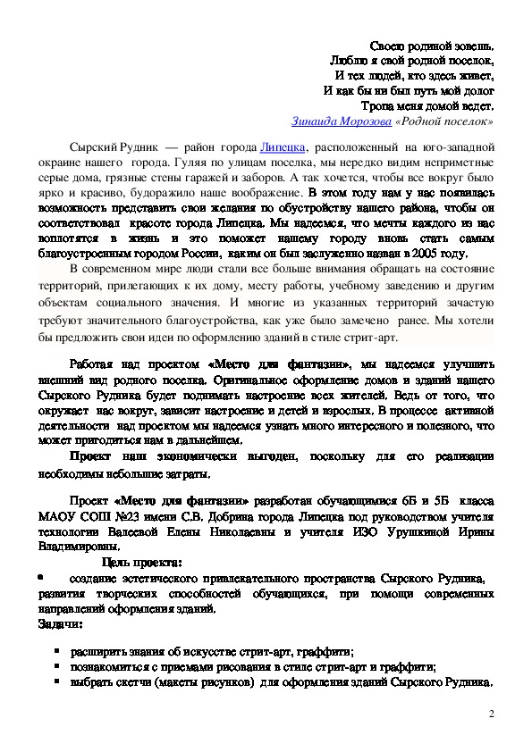 Работая над проектом «Место для фантазии», мы надеемся улучшить