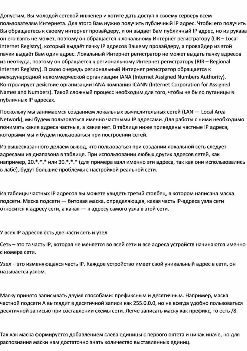 Поскольку мы занимаемся созданием локальных вычислительных сетей (LAN — Local Area Network), мы будем пользоваться именно частными IP адресами. Для работы с ними необходимо понимать какие адреса частные, а какие нет. В таблице ниже приведены частные IP адреса, которыми мы и будем пользоваться при построении сетей.