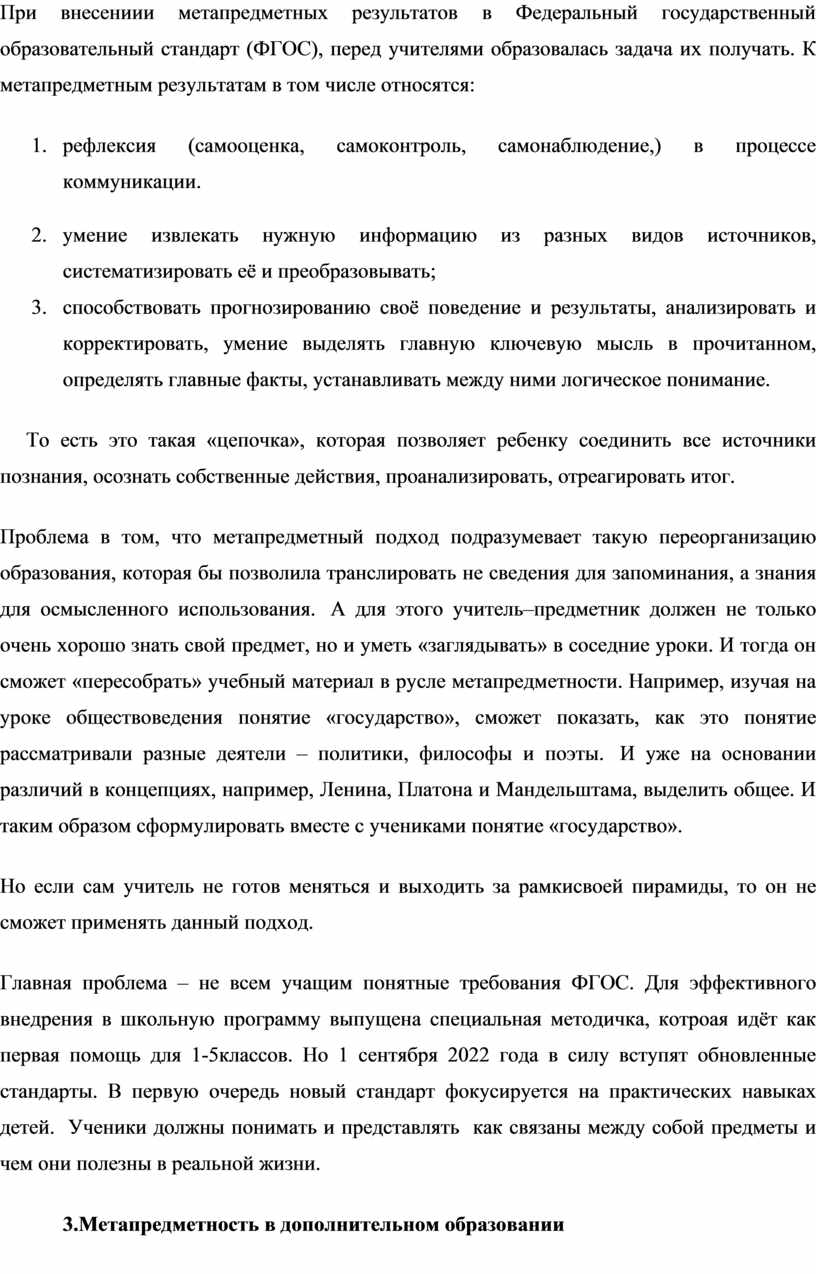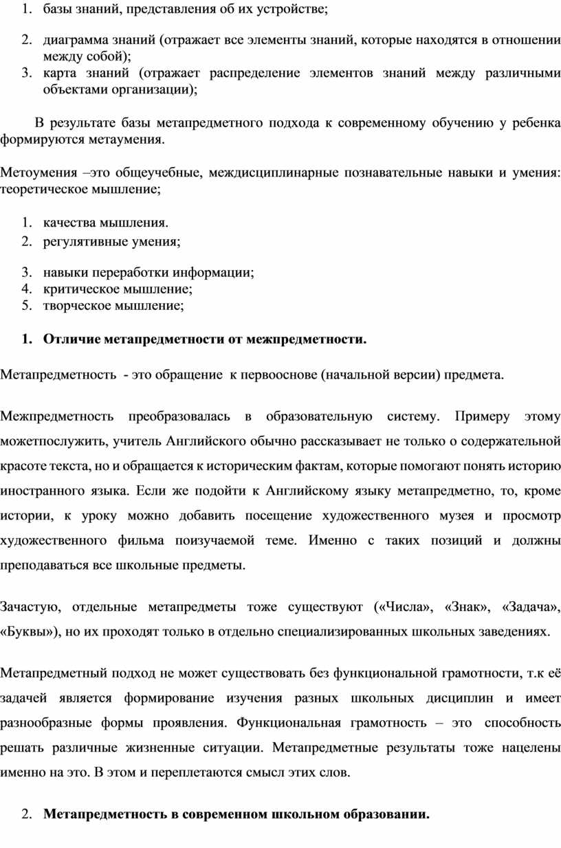 Межпредметность преобразовалась в образовательную систему. Примеру этому можетпослужить, учитель Английского обычно рассказывает не только о содержательной красоте текста, но и обращается к историческим фактам, которые помогают понять историю иностранного языка. Если же подойти к Английскому языку метапредметно, то, кроме истории, к уроку можно добавить посещение художественного музея и просмотр художественного фильма поизучаемой теме. Именно с таких позиций и должны преподаваться все школьные предметы.