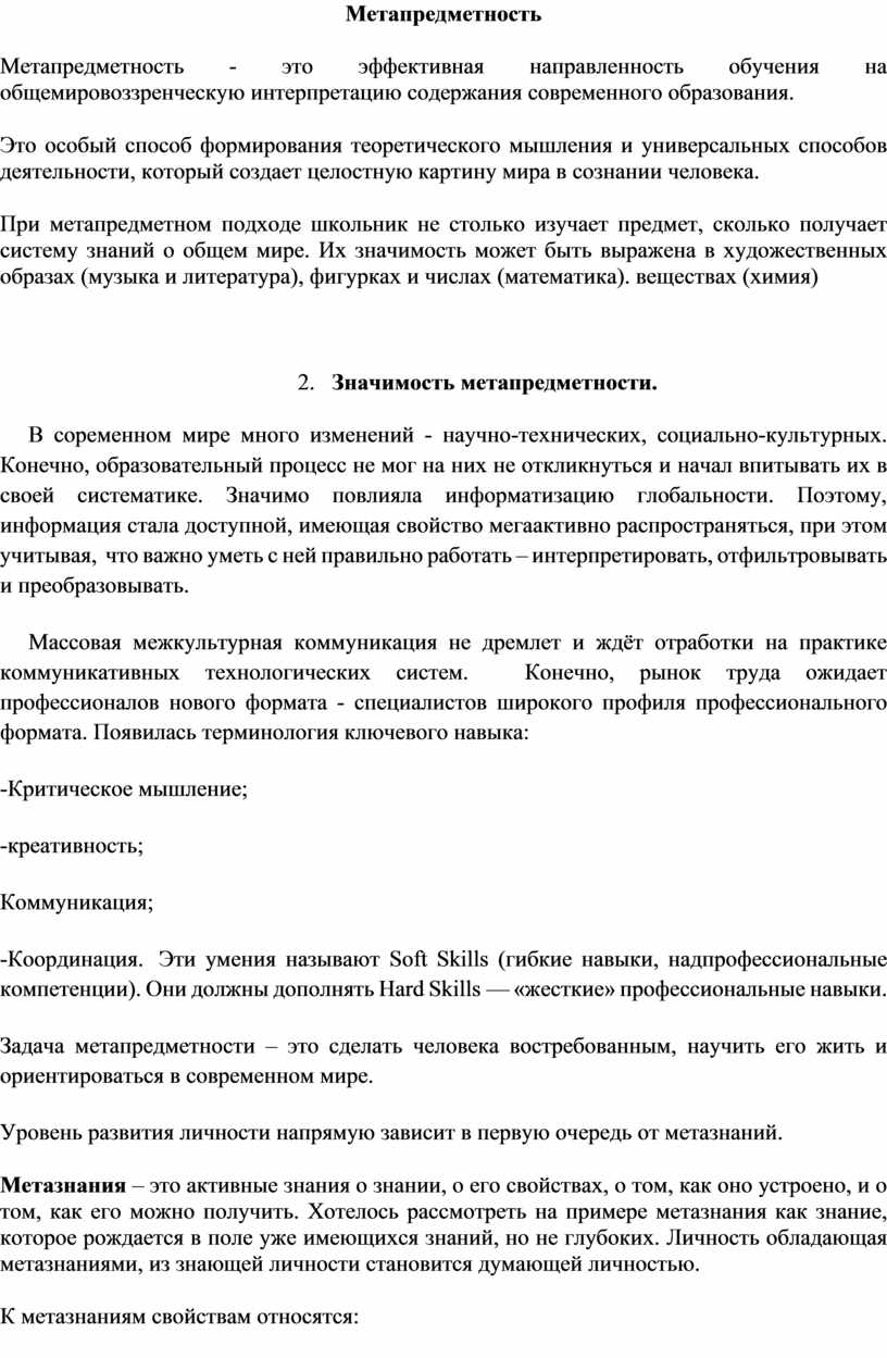 Метапредметность - это эффективная направленность обучения на общемировоззренческую интерпретацию содержания современного образования.